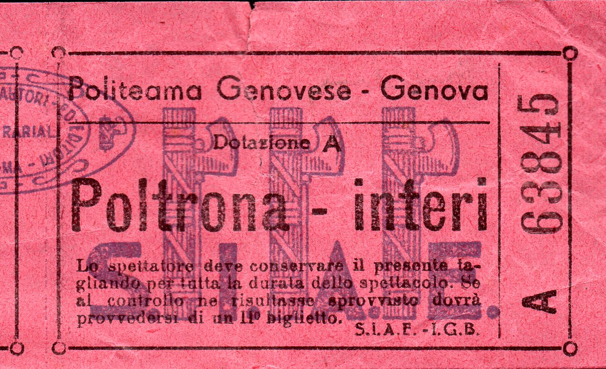 Biglietto del teatro Politeama Genovese, anche in questo teatro sono passate le grandi compagnie del passato.