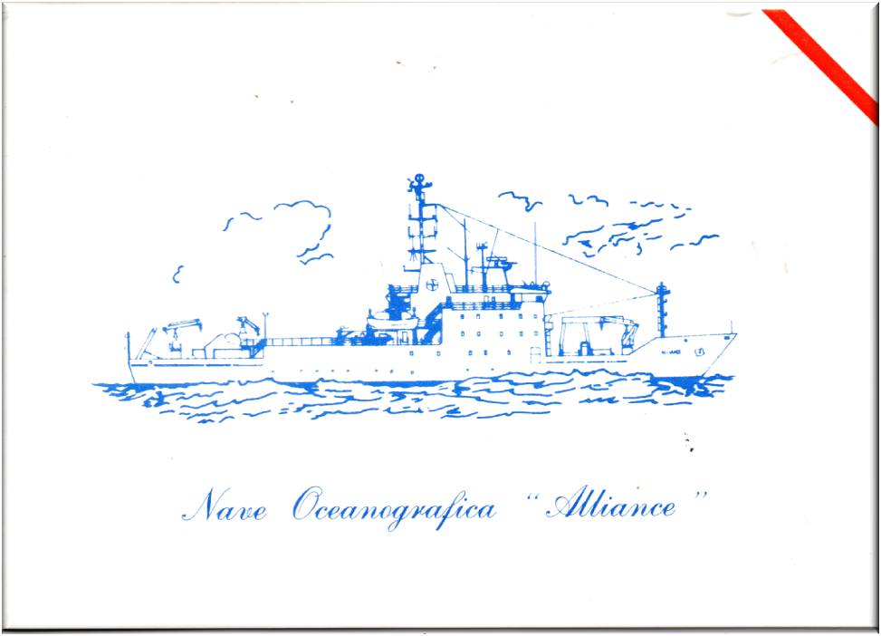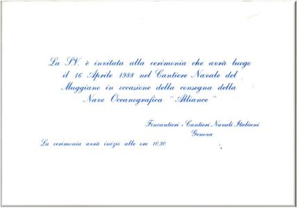 Biglietto di invito alla cerimonia del varo della Nave Oceanografica "Alliance", presso i cantieri Navali Italiani di Fincantieri, che si terra il 16 aprile 1988 alle ore 10,30