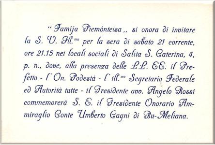 Biglietto di invito del Presidente avv. Angelo Rossi commemorerà S.E. il Presidente Onorario Ammiraglio Conte Umberto Cagni di Bu-Meliana.