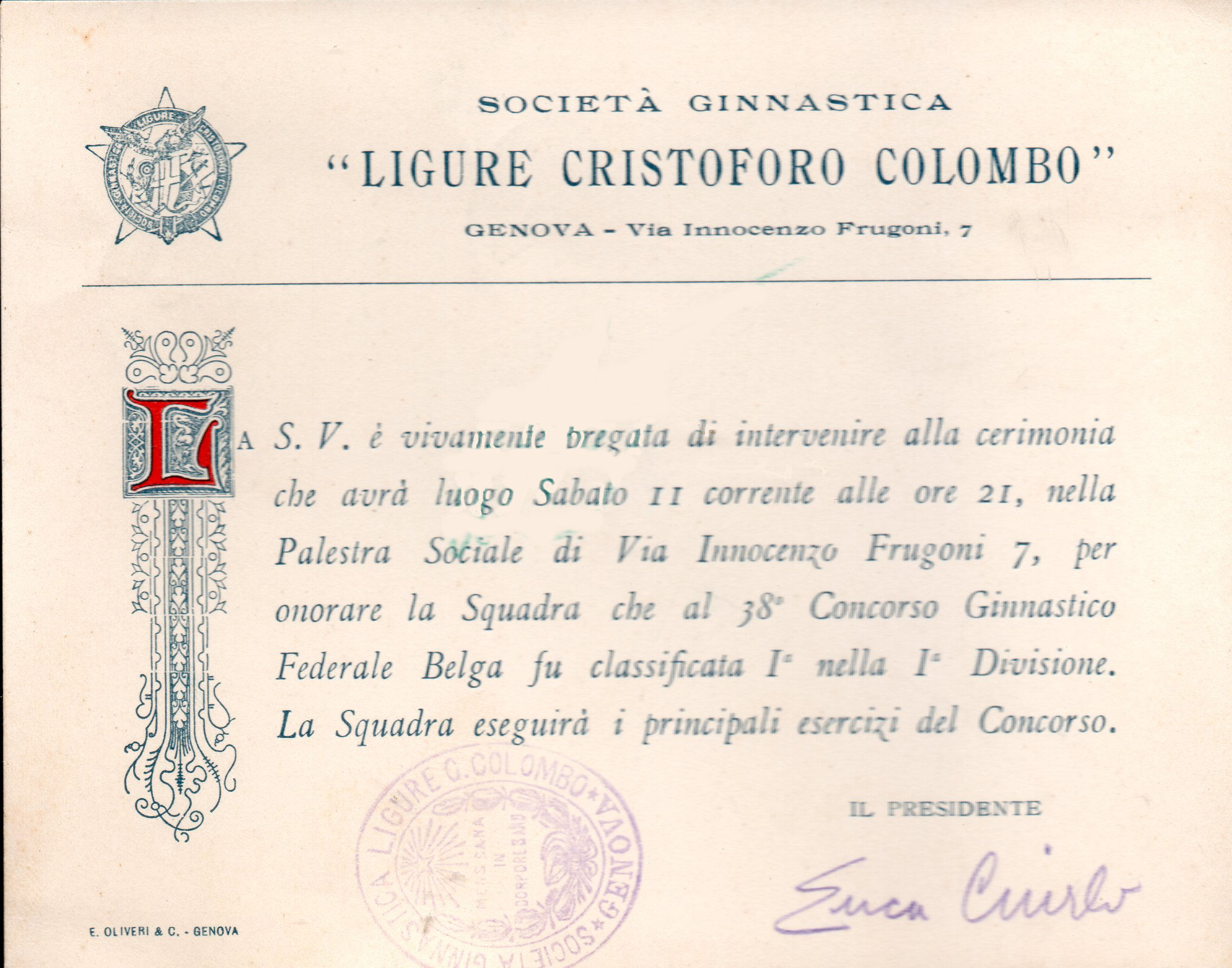 Società Ginnastica " LIGURE CRISTOFORO COLOMBO". Biglietto di invito a intervenire alla cerimonia presso la Palestra Sociale di Via Innocenzo Frugoni 7. per onorare la Squadra che al 38° Concorso Ginnastico Bela fu classificata I° nella I° Divisione. Il biglietto porta la firma del Presidente Luca Ciurlo, che fu anche un principe del foro genovese. Il biglietto è stato stampato dalla tipografia E. Olivieri & C. di Genova.