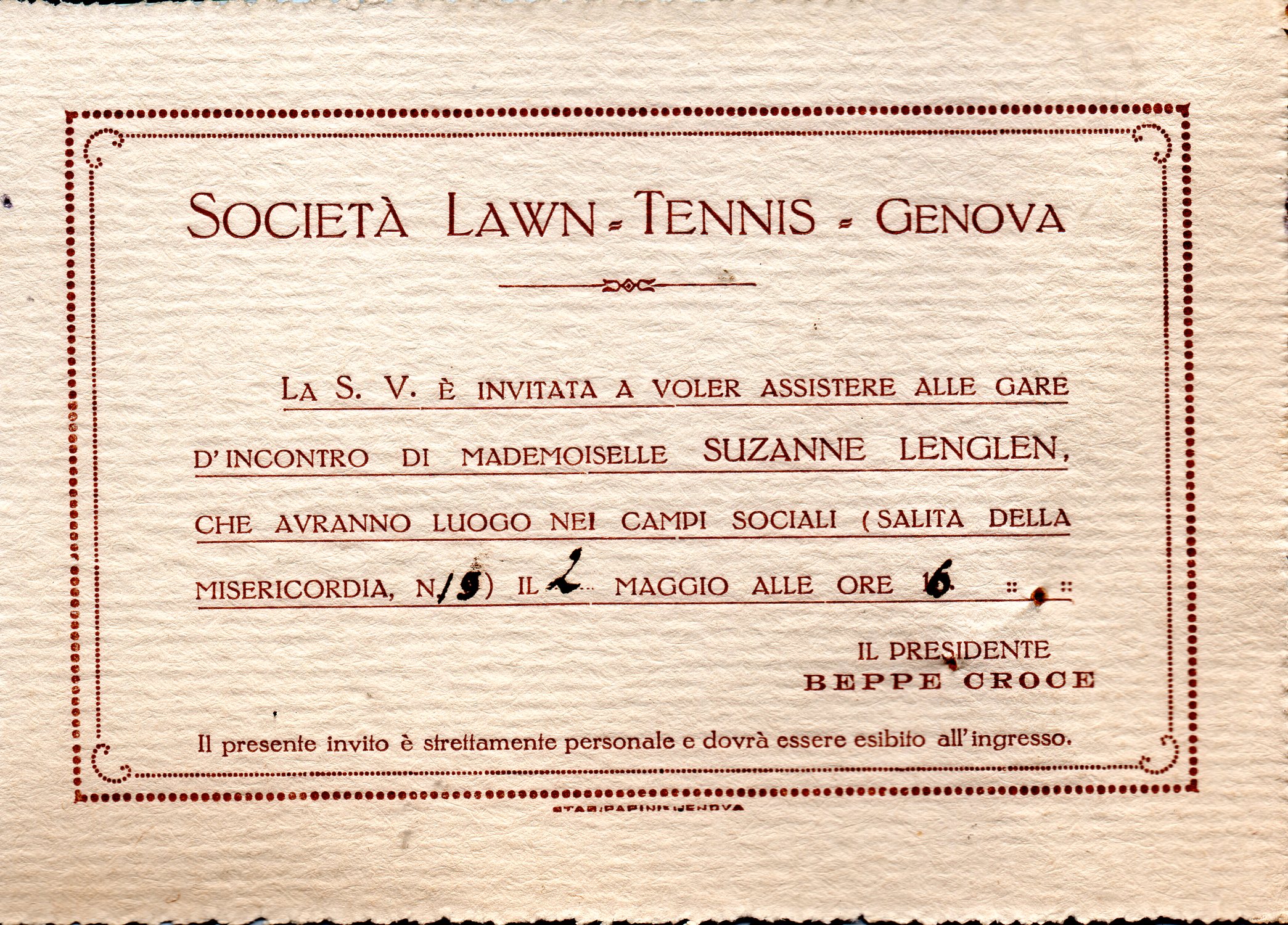 Biglietto di invito della SOCIETA' LAWN TENNIS GENOVA