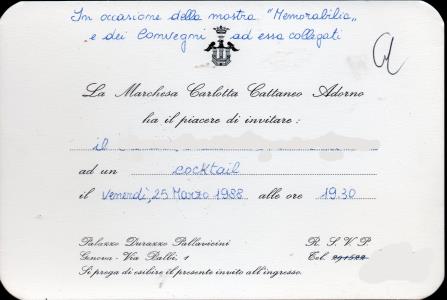 Biglietto di invito ad un cocktail offerto dalla Marchesa Carlotta Cattaneo Adorno, in data 25 marzo 1988 alle ore 19,30 nel suo palazzo Durazzo Pallavicini situato in via Balbi, 1