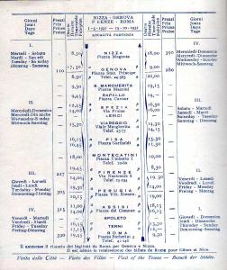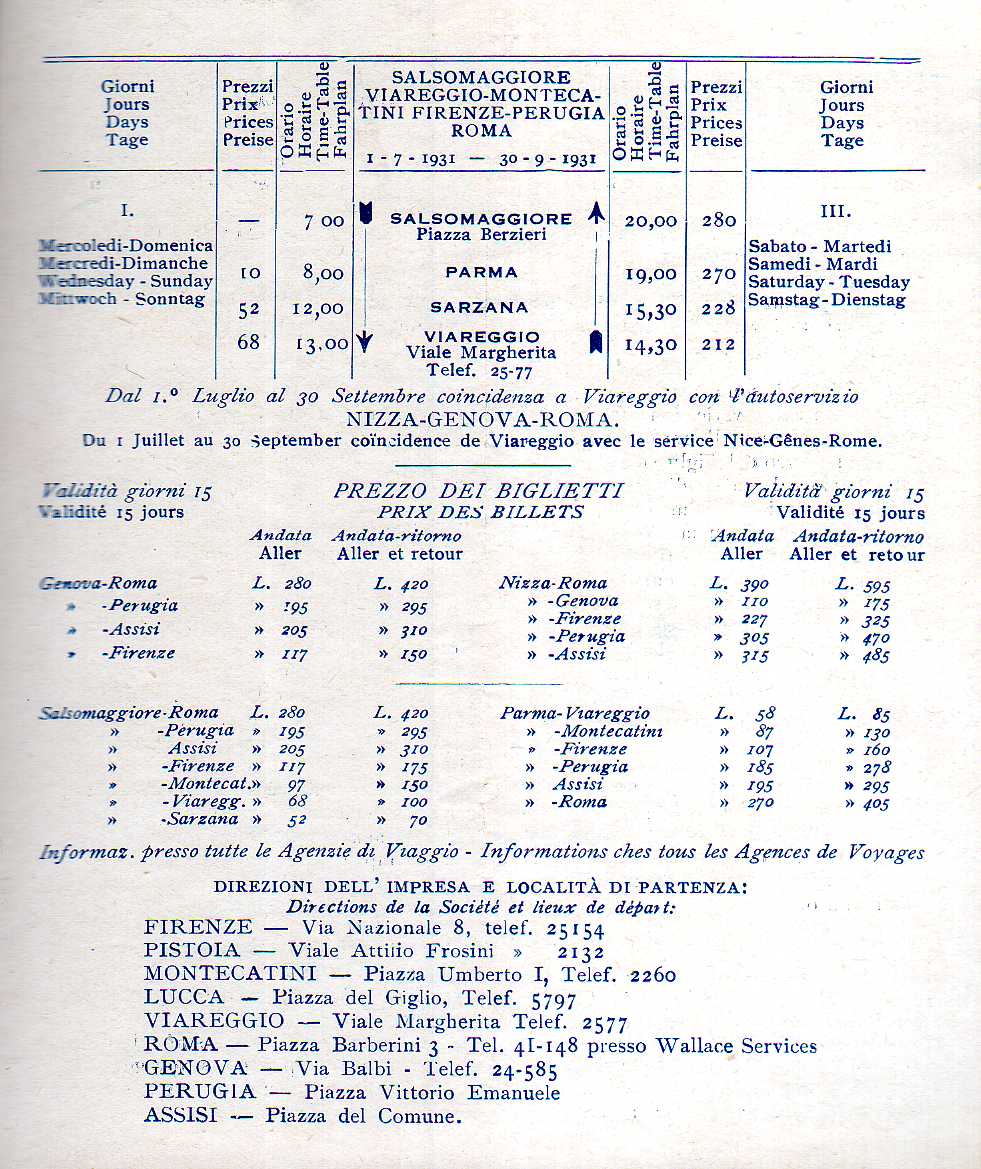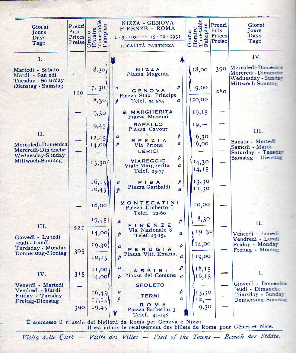 Stampato dalla ditta Niccolai-Pistoia, gli orari e le tariffe per la linea Nizza - Genova - Firenze - Roma riguardano il periodo dal 1 marzo 1931 al 15 ottobre 1931, e per la linea Salsomaggiore - Viareggio - Montecatini Firenze - Perugia Roma dal 1 luglio 1931 al 30 settembre 1931.
