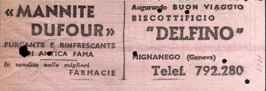 Nella parte posteriore del biglietto, con le pubblicità:del "Biscottificio "DELFINO"