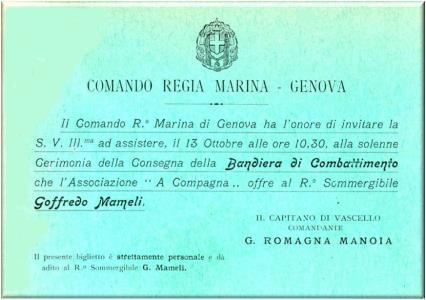 Biglietto di invito alla cerimonia del 13 ottobre 1929? per la consegna della Bandiera di Combattimento al R.Sommergibile Goffredo Mameli.