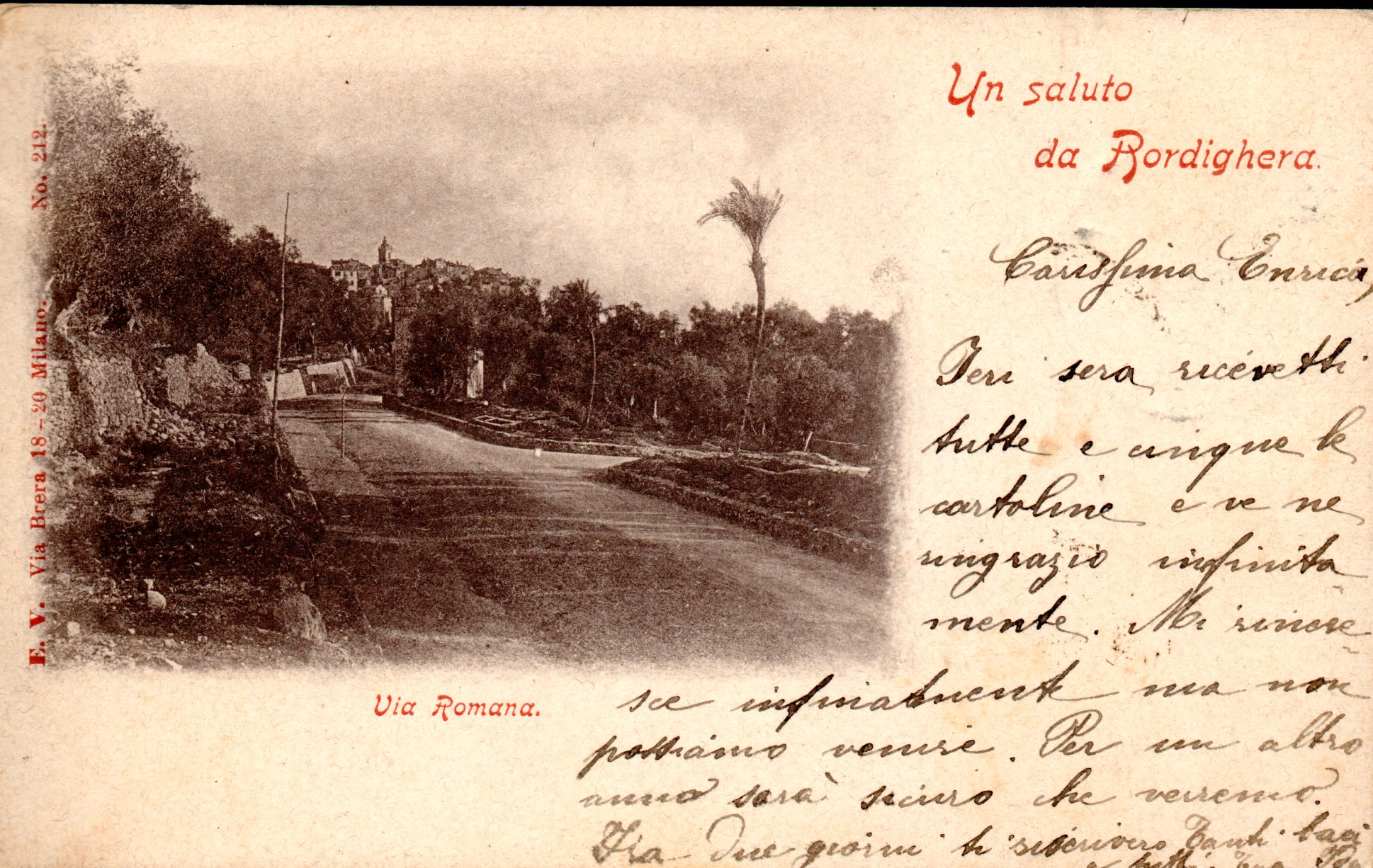 Cartolina viaggiata in data 23 settembre 1900. Bordighera, la via Romana. Ed. F. V. Milano Alb.2 Sc.4 P.5