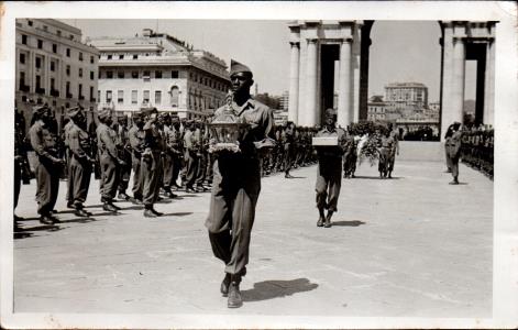 Cartolina fotografica, della manifestazione fatta dalle truppe alleate, per la riconsegna al Municipio di Genova dopo lo sfollamento.
