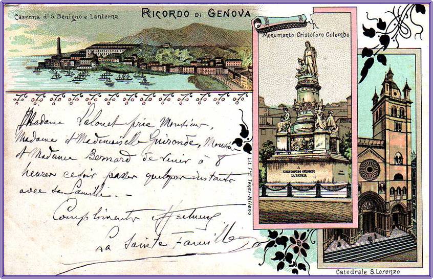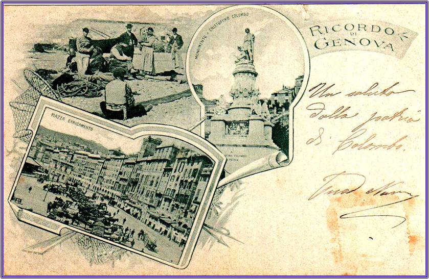 Tre immagini che fanno ricordare Genova, i pescatori, la stazione del Principe vista dalla scuola di Marina e la Chiesa dell'Annunziata e a coronamento l'immagine del grande navigatore Cristoforo Colombo.