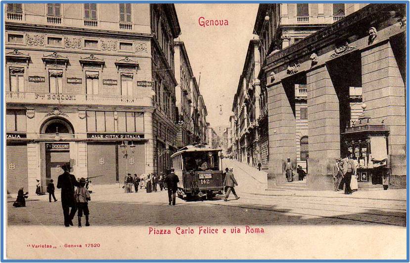 Nel palazzo di fronte aveva sede la ditta F.Bocconi, vendita di abiti, biancherie, telerie ed era dotata di sartoria per vestiti su misura, la ditta aveva altri due negozzi uno in galleria Mazzini e l'altro in piazza della Nunziata.