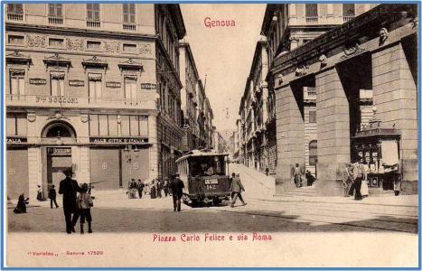In primo piano la carrozza dell'Hotel Heder che si avvia verso la stazione Principe, mentre il tram matr.102 prosegue la sua corsa verso De Ferrari.