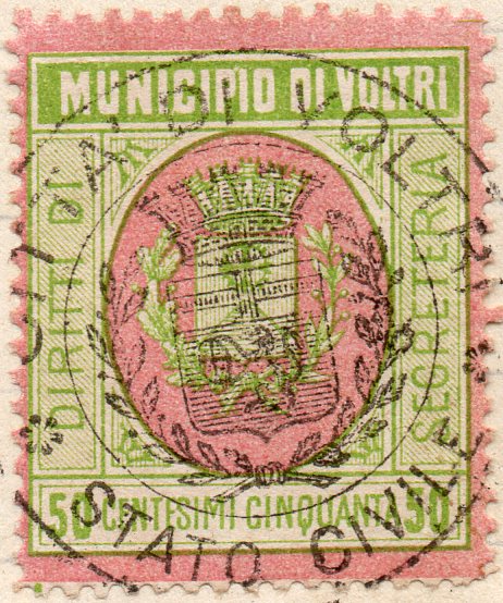 Municipio di Voltri, marca municipale per diritti di segreteria da Cent. 50, utilizzata in data 10 ottobre 1904.