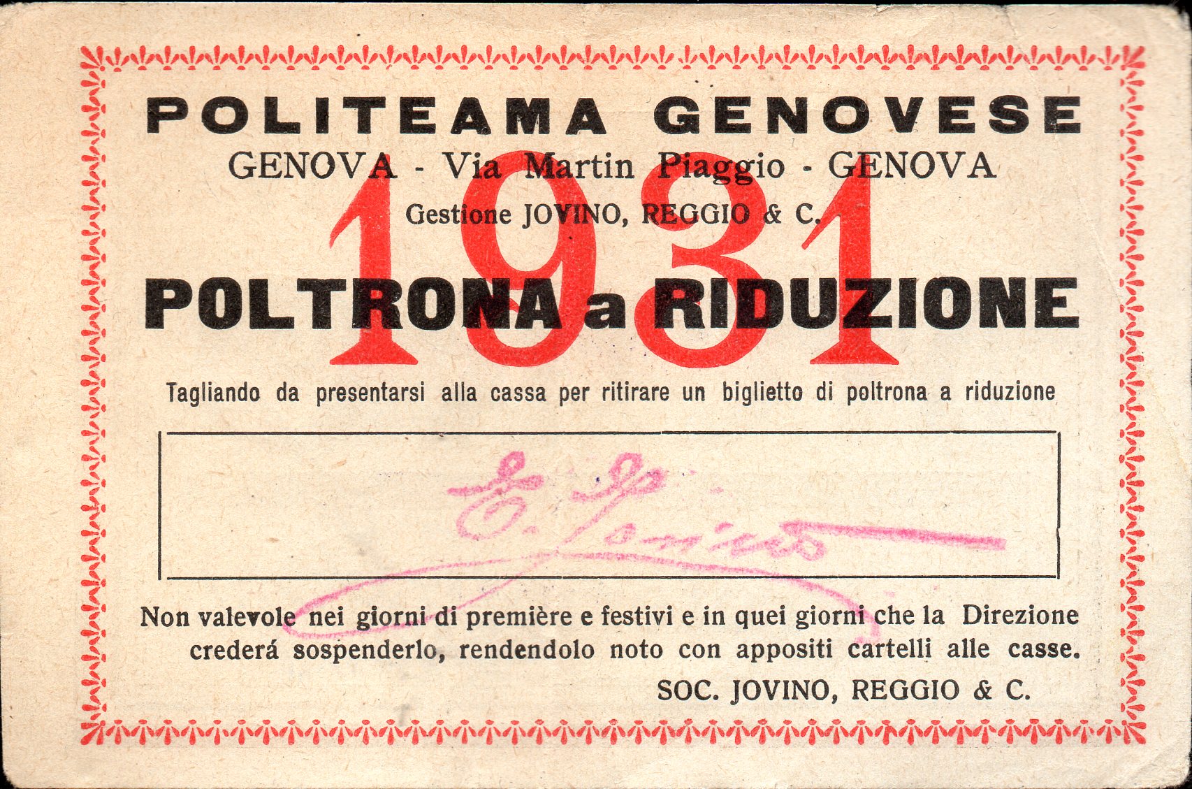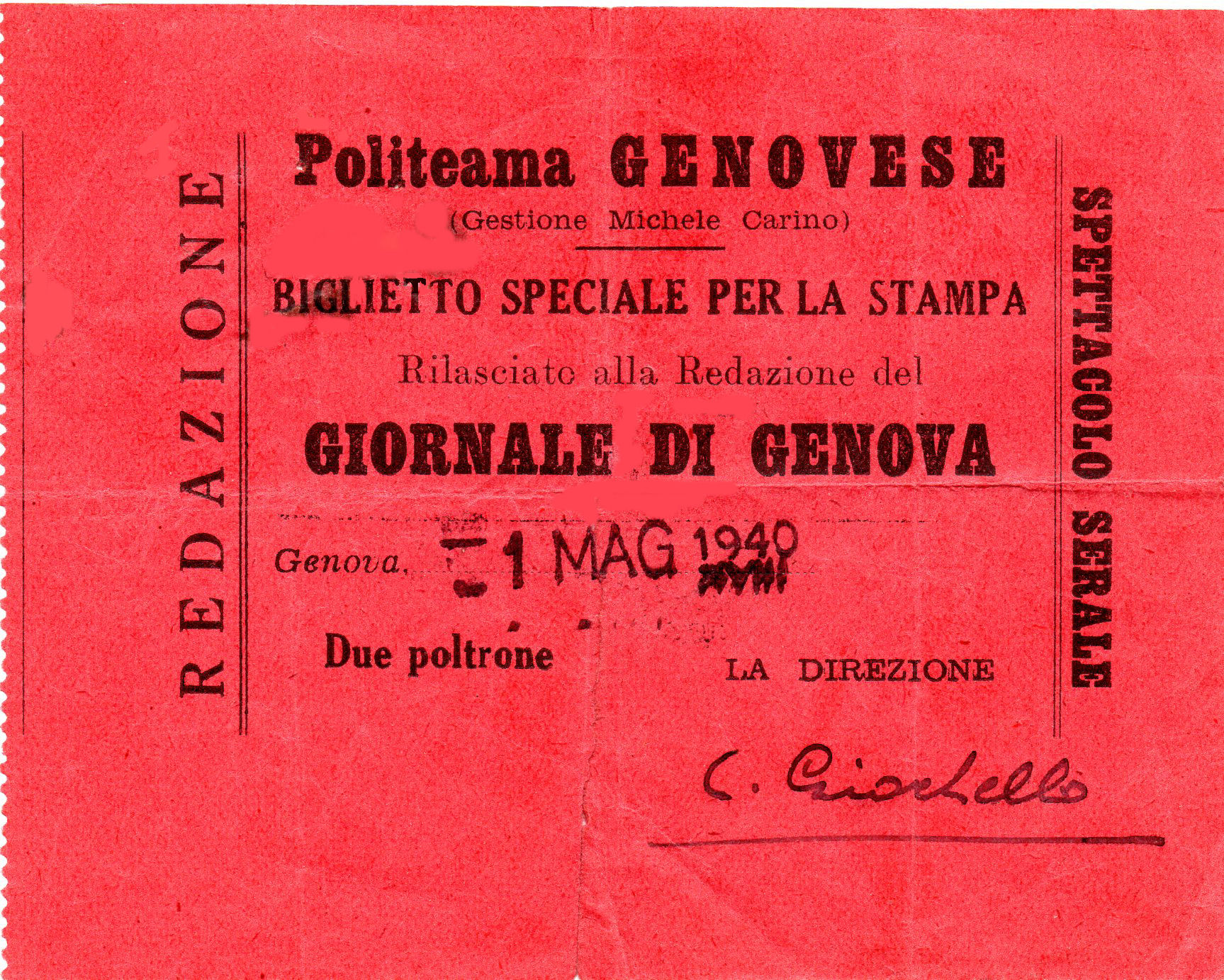 Biglietto speciale per la stampa del teatro Politeama Genovese, rilasciato alla redazione del GIORNALE DI GENOVA.