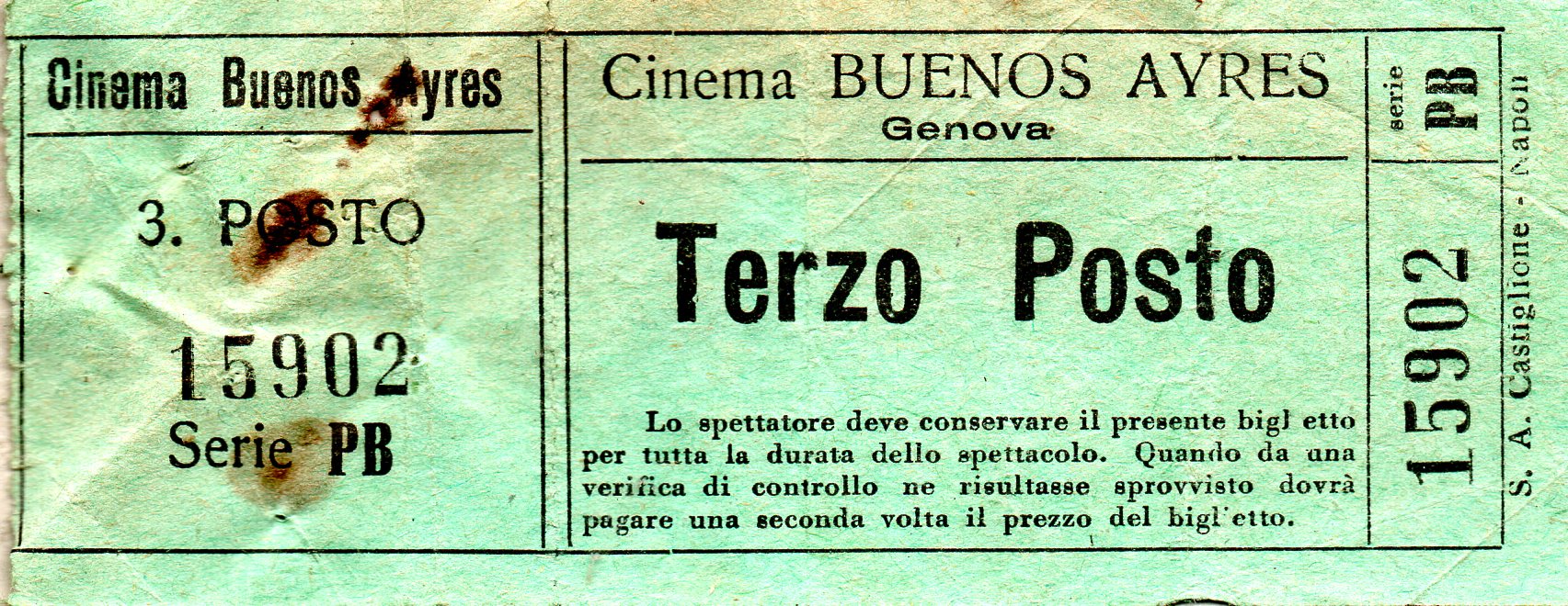 Nel retro del biglietto vi è una nota scritta probabilmente dall'utilizzatore del biglietto che ci permette di risalire alla data precisa ed allo spettacolo che era stato proiettato quel giorno.