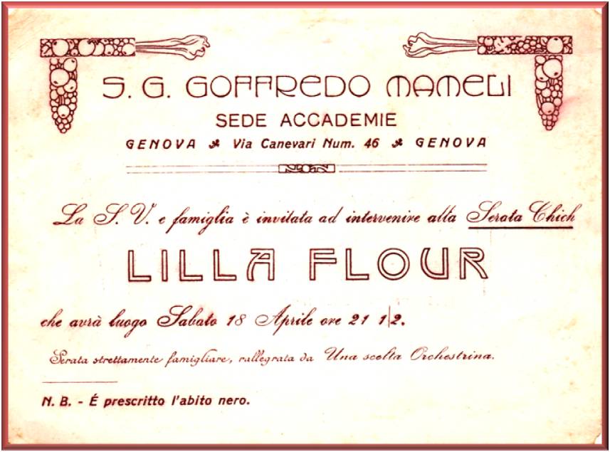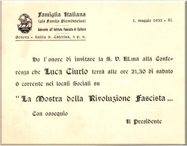 Biglietto dell'Ass. Famiglia Italiana (già famija piemonteisa) d'invito ad assistere alla Conferenza, tenuta dall'allora Avv. Luca Ciurlo, molto noto tra i principi del foro genovese.