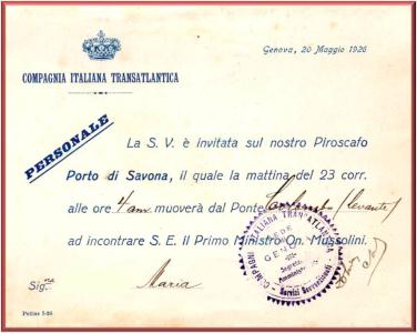 Biglietto d'invito sul Piroscafo Porto di Savona, il quale la mattina del 23 corr. alle ore 4 muoverà dal Ponte Colombo (Levante) ad incontrare S.E. il Primo Ministro On. Mussolini.
