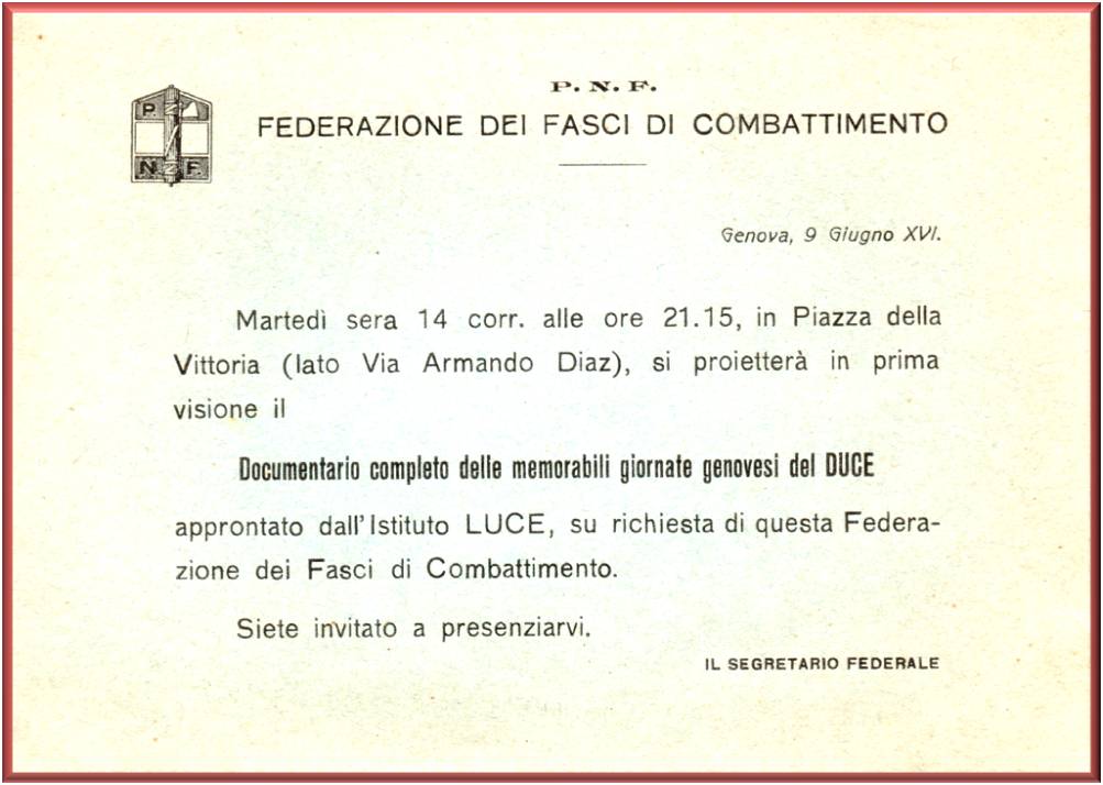 Manifestazione organizzata in Piazza della Vittoria (lato via Armando Diaz), in prima visione si proietterà:Il Documentario completo delle memorabili giornate genovesi del DUCE
