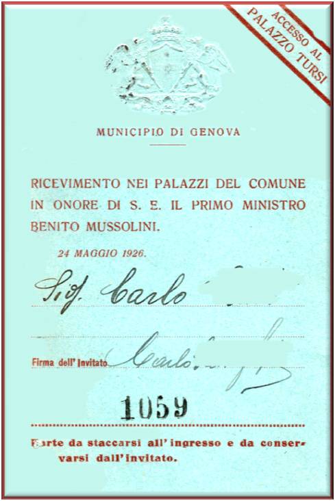 Biglietto d'invito per la visita del Primo Ministro Benito Mussolini a Palazzo Tursi.