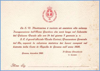Biglietto d'invito ad assistere alla solenne Inaugurazione dell'Anno Giuridico che avrà luogo nel Salonetto del Palazzo Ducale alle ore 14 del giorno 7 gennaio 1927