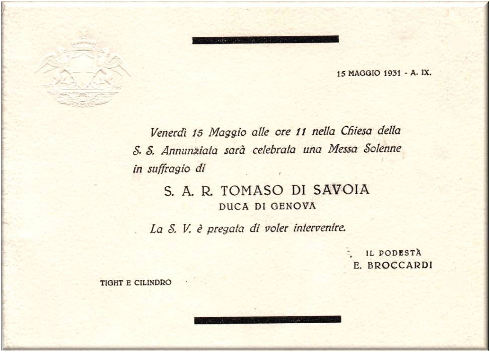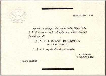 Biglietto d'invito per la Messa che si sarebbe tenuta alle 11 del 15 Maggio del 1931 nella Chiesa della S.S. Annunziata in suffragio di S.A.R. Tomaso di Savoia Duca di Genova.