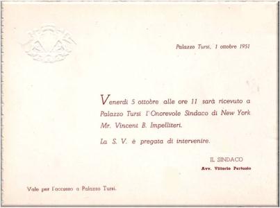 Biglietto d'invito a Palazzo Tursi in data 1 ottobre 1951 alla visita dell'Onorevole Sindaco di New York Mr. Vincent B. Impelliteri.