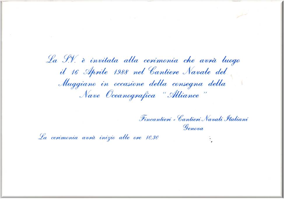Biglietto di invito alla cerimonia del varo della Nave Oceanografica "Alliance", presso i cantieri Navali Italiani di Fincantieri, che si terra il 16 aprile 1988 alle ore 10,30