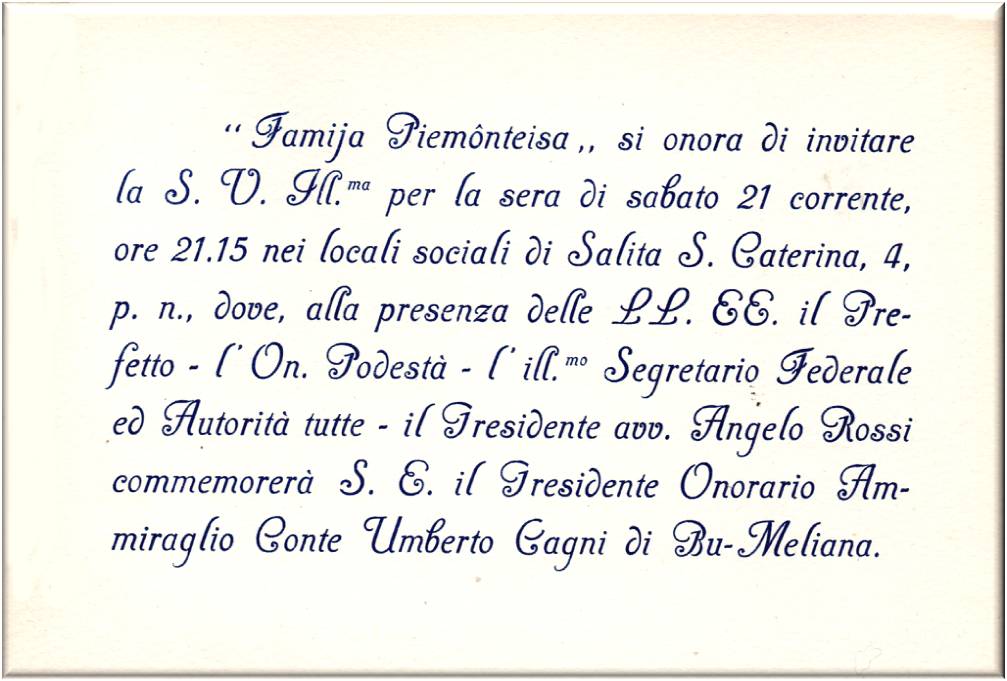 Biglietto di invito del Presidente avv. Angelo Rossi commemorerà S.E. il Presidente Onorario Ammiraglio Conte Umberto Cagni di Bu-Meliana.