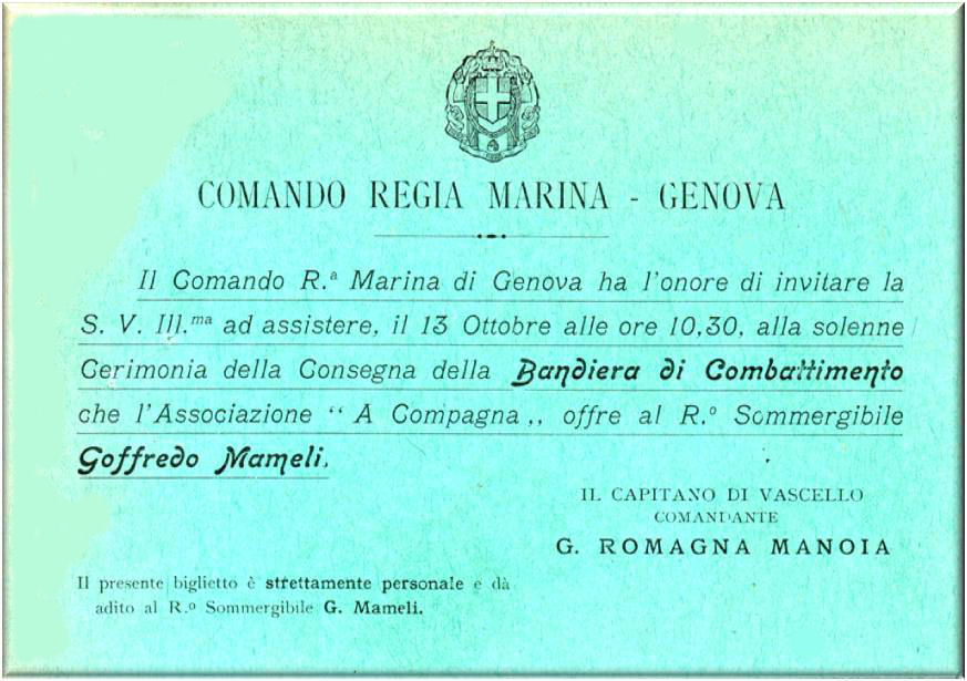 Biglietto di invito alla cerimonia del 13 ottobre 1929? per la consegna della Bandiera di Combattimento al R.Sommergibile Goffredo Mameli.