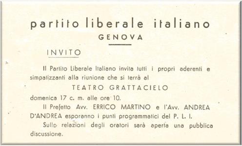 Biglietto di invito alla presentazione del programma, tenuto al teatro Gratacielo di Genova, alle ore 10 del 17 c.m., purtroppo non è scritto l'anno, dovrebbe essere tra il 1946 e il 1950.