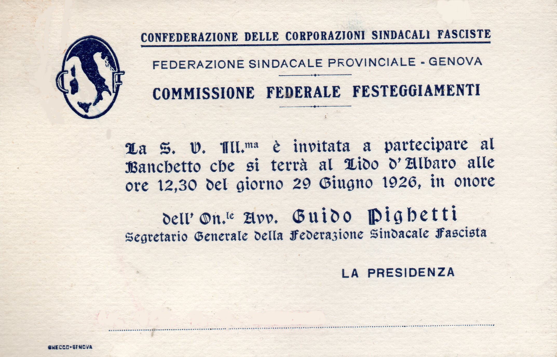 Biglietto d'invito da parte della Commissione Federale Festeggiamenti, a partecipare al Banchetto che si terra al Lido d'Albaro alle ore 12,30 del giorno 29 Giugno 1926, in onore dell'On.le Guido Pighetti.