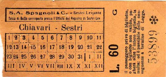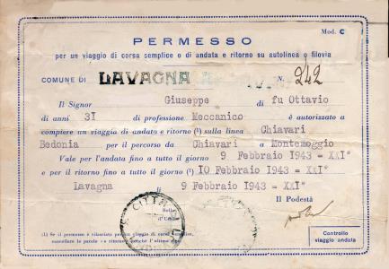 Documento importante emesso dal Comune di Lavagna per autorizzare un cittadino a compiere un viaggio di andata e ritorno sulla linea Chiavari-Bedonia.