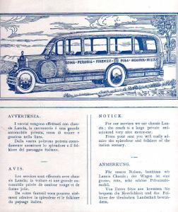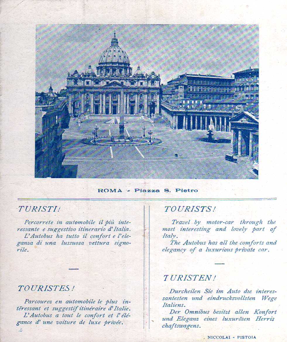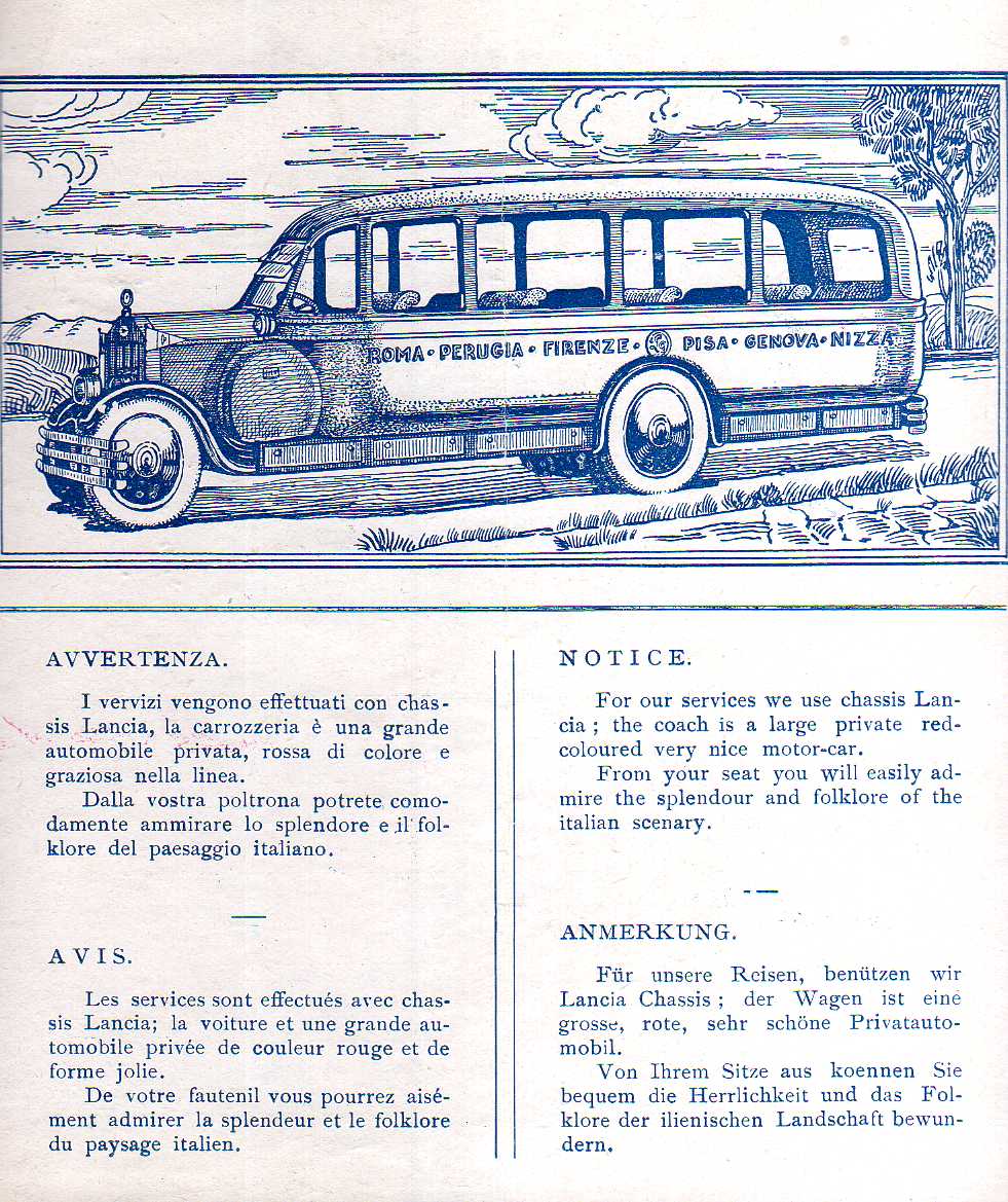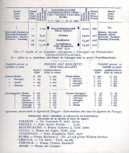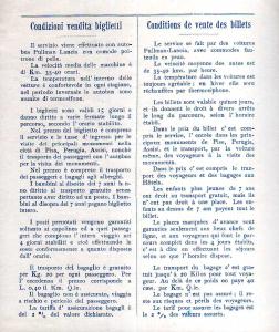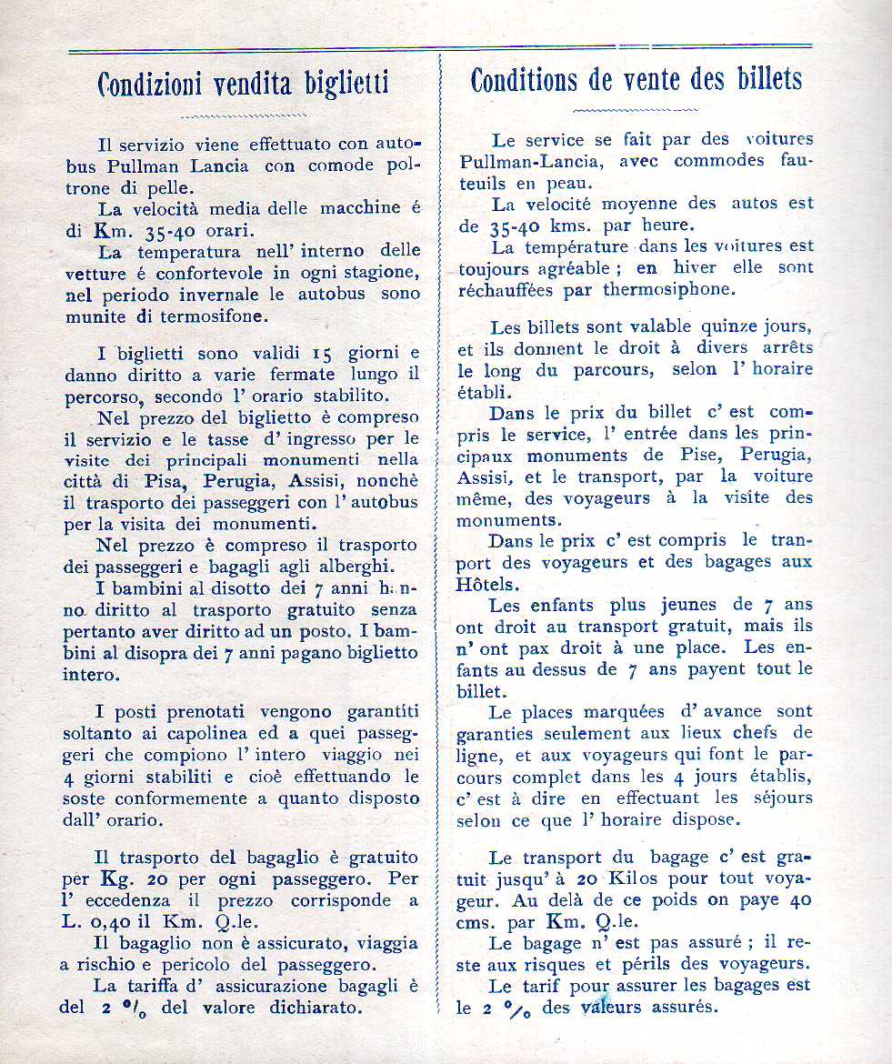 Stampato dalla ditta Niccolai-Pistoia, gli orari e le tariffe per la linea Nizza - Genova - Firenze - Roma riguardano il periodo dal 1 marzo 1931 al 15 ottobre 1931, e per la linea Salsomaggiore - Viareggio - Montecatini Firenze - Perugia Roma dal 1 luglio 1931 al 30 settembre 1931.