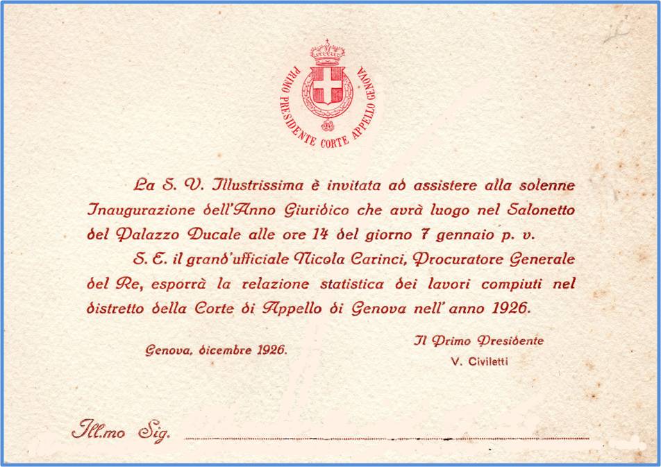 Biglietto d'invito ad assistere alla solenne Inaugurazione dell'Anno Giuridico che avrà luogo nel Salonetto del Palazzo Ducale alle ore 14 del giorno 7 gennaio 1927