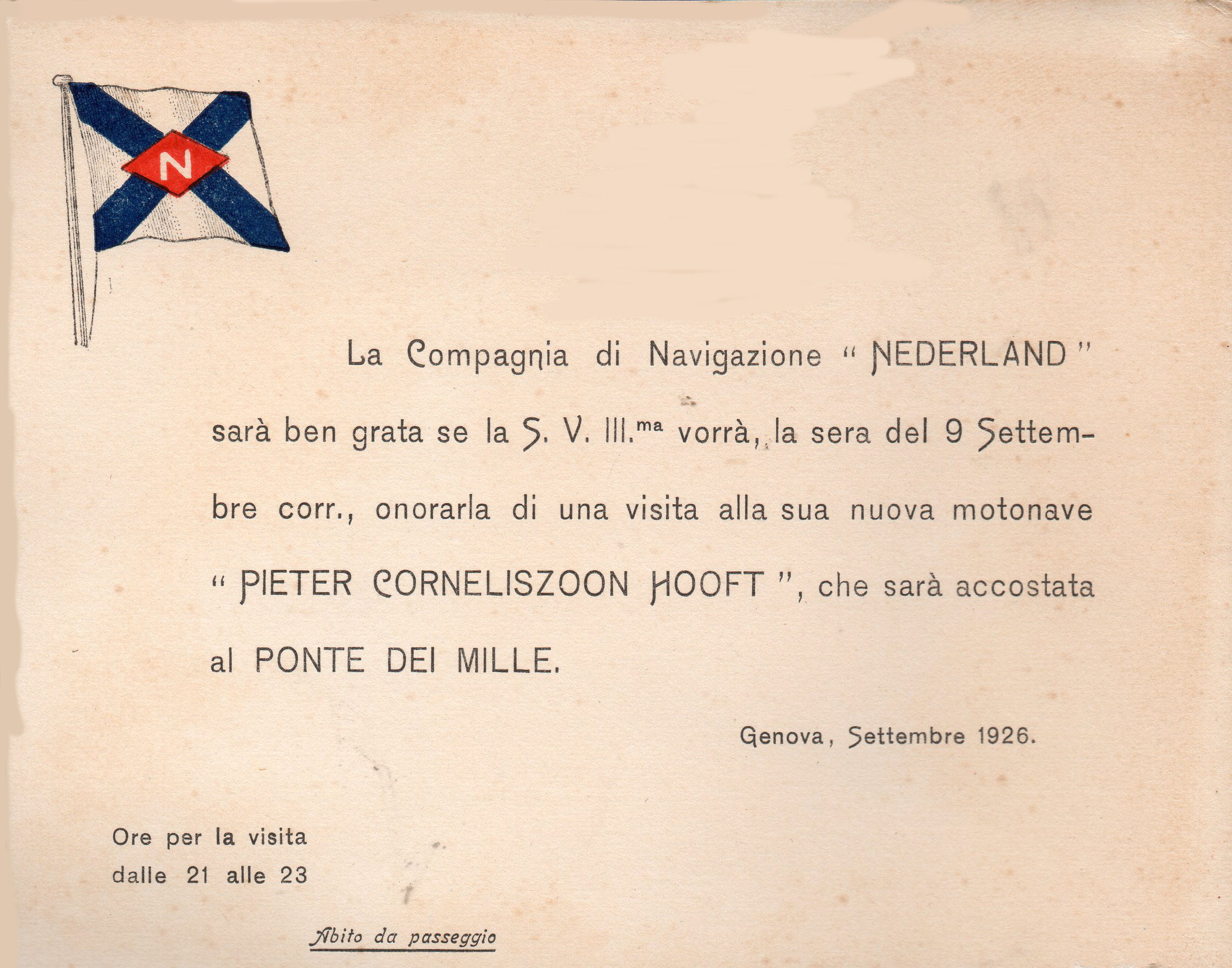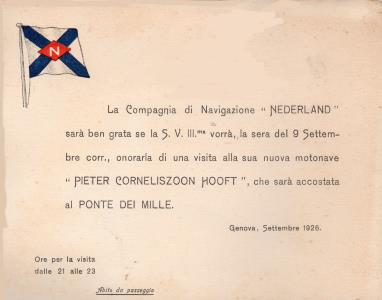 Nel biglietto si chiede la presenza la sera del 9 settembre 1926 per visitare la motonave " Pieter Corneliszoon Hooft" che sarà accostata al Ponte dei Mille.