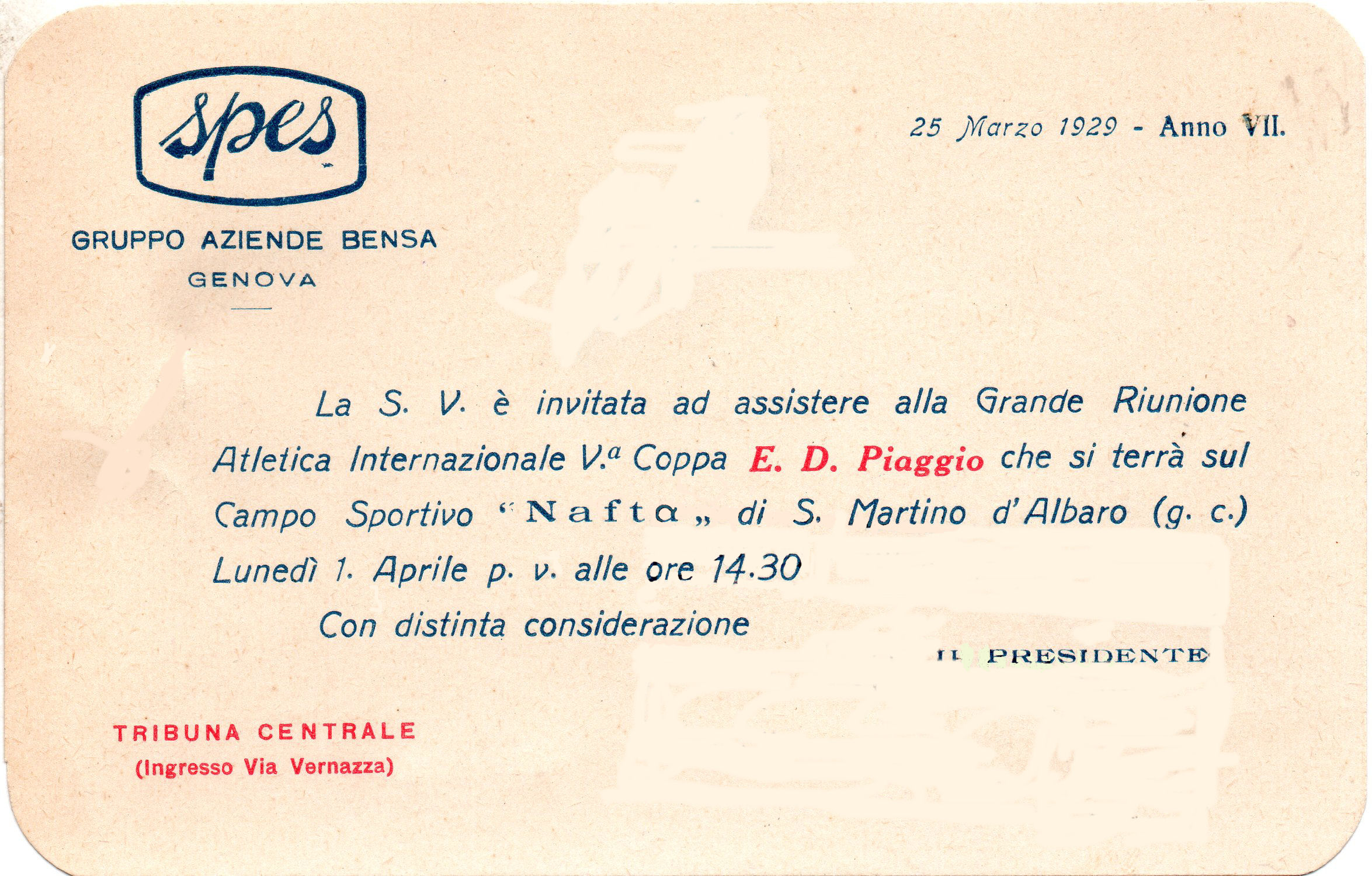 Biglietto d'invito alla grande riunione atletica Internazionale V° Coppa E.D.Piaggio che si terrà sul Campo Sportivo Nafta di S.Martino d'Albaro, lunedì 1 aprile 1929 alle ore 14,30.