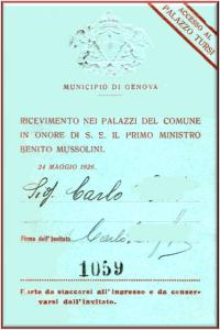 Biglietto d'invito per la visita del Primo Ministro Benito Mussolini a Palazzo Tursi.