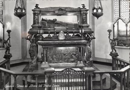 Cartolina nuova, riproducente l'urna con i resti di Francesco Maria da Camporosso, comunemente ricordato come Padre Santo.