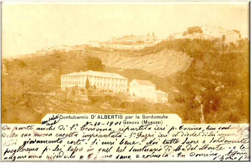 Quest'opera nasce dalla volontà di Giovanni Battista d'Albertis (Genova1784-1862), quartogenito di Domenico Desiderio, ordinato sacerdote nel 1806. Nel 1816 assume l'incarico di professore di "Sacra Scrittura e Lingua Ebraica" all'Università di Genova sino al 1831, quando il re Carlo Felice lo nomina Vescovo di Ventimiglia. Uomo rigoroso, ostile alla politica ecclesiastica di Carlo Alberto ed in conflitto con le autorità civili e l'ambiente curiale, si dimette nel 1836 e si ritira nella sua villa sita nel quartiere di S.Fruttuoso in Genova, dedicandosi allo studio ed alla carità, con particolare interesse per i sordomuti. Alla sua morte, dispone che il proprio patrimonio e la villa siano destinati a finanziare e ad accogliere un istituto di educazione per ragazze povere e sordomute: nasce così nel 1863 il "Contubernio G.B.D'Albertis"