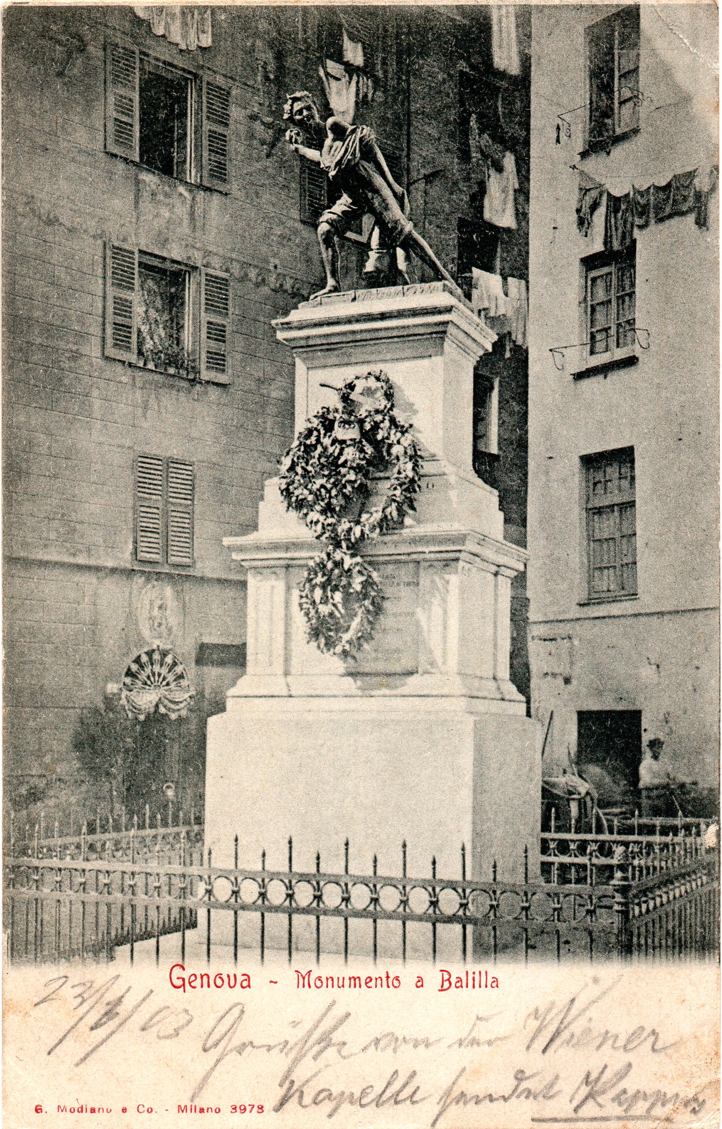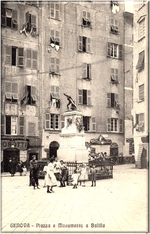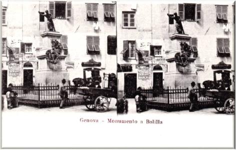 Monumento a Balilla nella sua originale collocazione, la piazza di Portoria, antico e storico quartiere Genovese, demolito negli anni 70 del secolo scorso.
