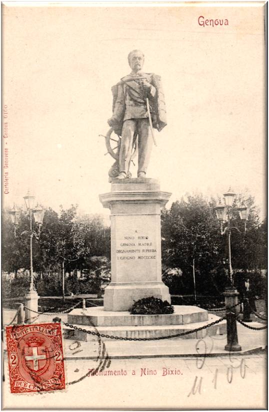 Cartolina viaggiata nel 1907, vi è rappresentato il monumento all'eroe garibaldino Nino Bixio.