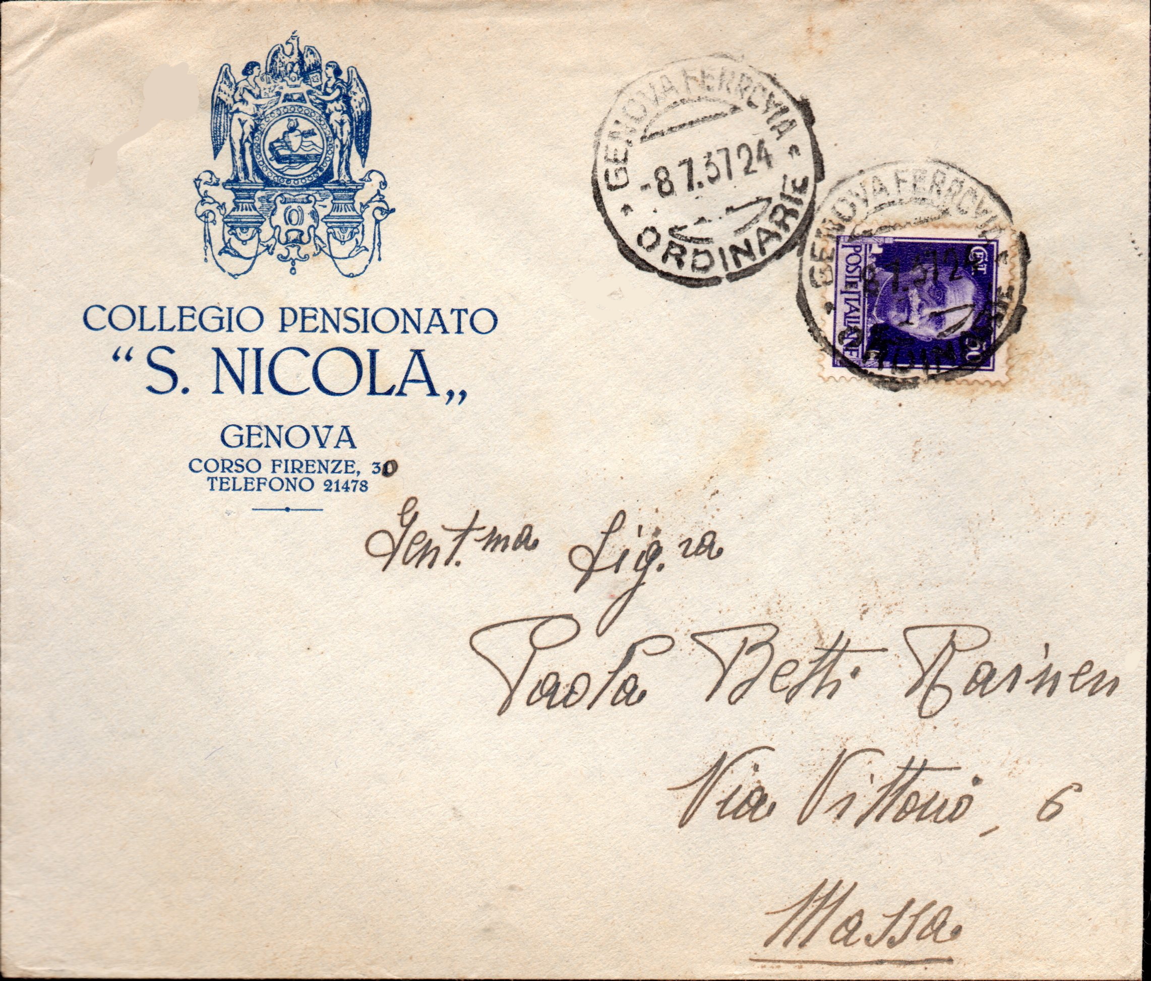 Lettera del collegio spedita da Genova per Massa in data 8 luglio 1937.