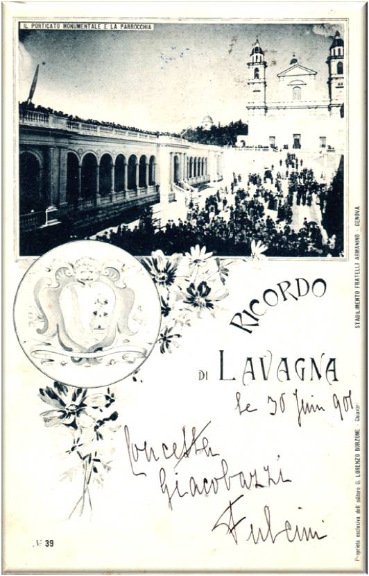 Nella cartolina è visibile il porticato monumentale e la parrocchia di Lavagna.