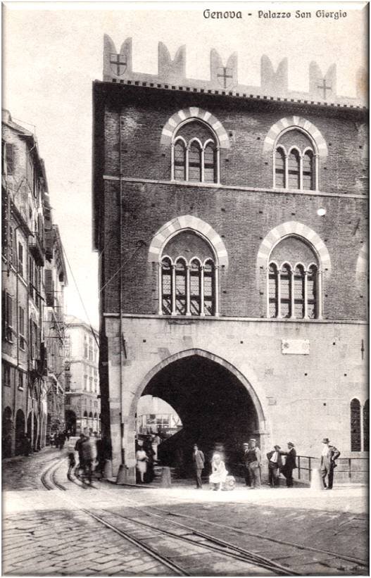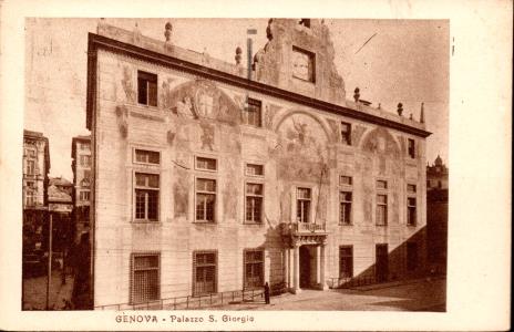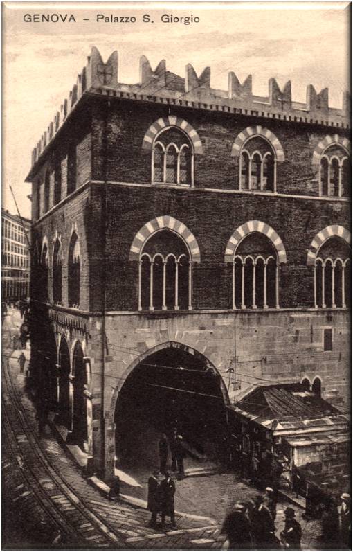 Palazzo S.Giorgio. La costruzione gotica dello storico edificio risale al 1260, commissionato dal Capitano del Popolo Simone Boccanegra, l'opera si deve a frate Oliverio, cistercense dell'Abbazia di S.Andrea di Sestri già impegnato nel prolungamento del Molo vecchio.