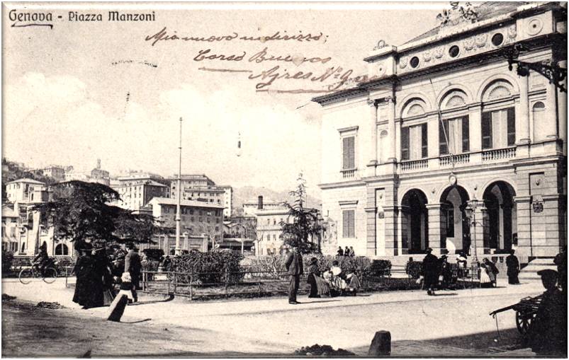 Cartolina viaggiata in data 1 gennaio 1913, lo stabile che si vede in primo piano era stato costruito per essere la sede del comune di San Fruttuoso, venne terminata la costruzione quando S,Fruttuoso venne accorpato a Genova, il progetto è dell'Ingegner. Pietro Pellas, lo stabile divenne poi la scuola magistrale Baliano, oggi è sede del consiglio circoscrizionale di S,Fruttuoso.