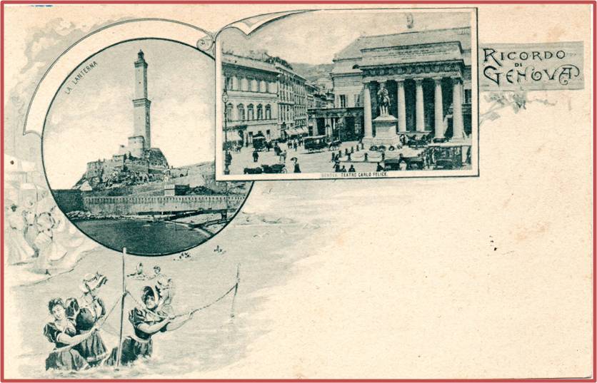 Tre immagini che fanno ricordare Genova, le lavandaie, i truogoli di S.Brigida e la piazza Corvetto con il monumento a Vittorio Emanuele II.