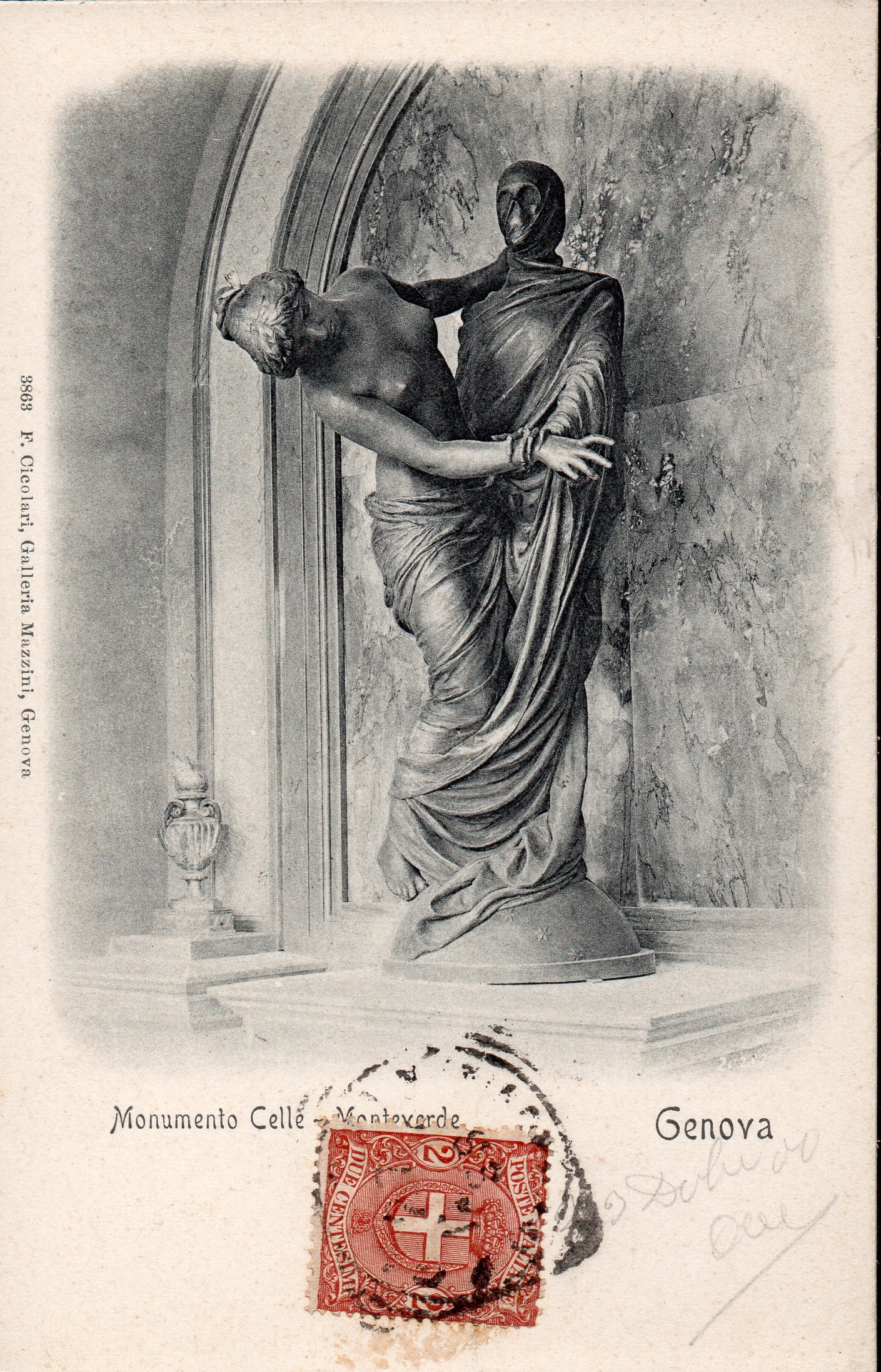 Scultore Giulio Monteverde Collocazione: Porticato Superiore a Levante Ediz. F. Cicolari, Galleria Mazzini. Cartolina con scritte in rosso