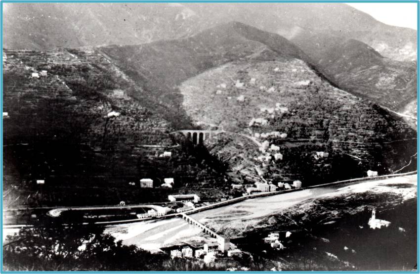 E' visibile il ponte Carrega nella sua lunghezza totale, nel tempo venne tagliato a causa della costruzione di via Lungobisagno Istria.