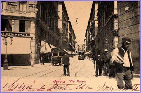 In primo piano la carrozza dell'Hotel Heder che si avvia verso la stazione Principe, mentre il tram matr.102 prosegue la sua corsa verso De Ferrari.