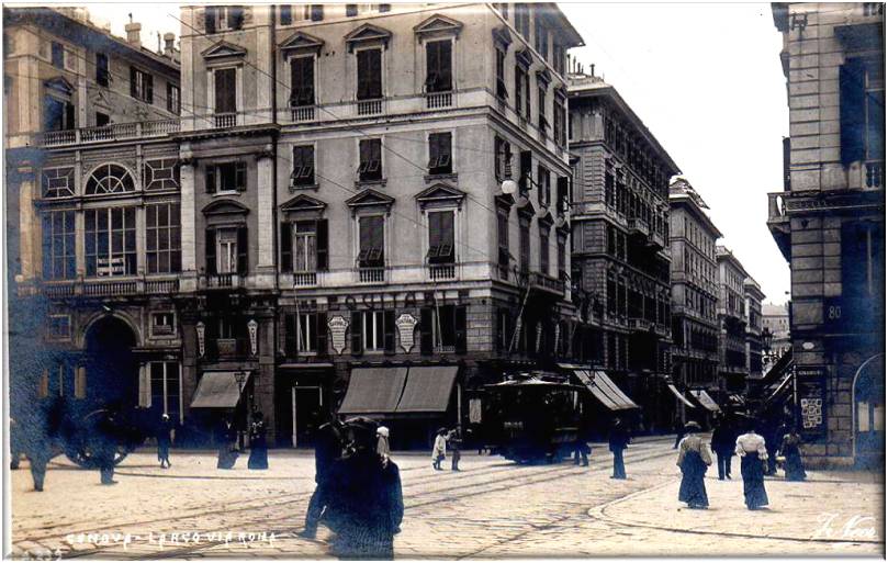 Nel palazzo di fronte aveva sede la ditta F.Bocconi, vendita di abiti, biancherie, telerie ed era dotata di sartoria per vestiti su misura, la ditta aveva altri due negozzi uno in galleria Mazzini e l'altro in piazza della Nunziata.