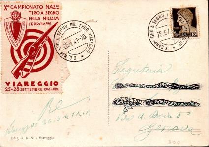 Cartolina ricordo del X CAMPIONATO DI TIRO A SEGNO DELLA MILIZIA FERROVIARIA A VIAREGGIO.