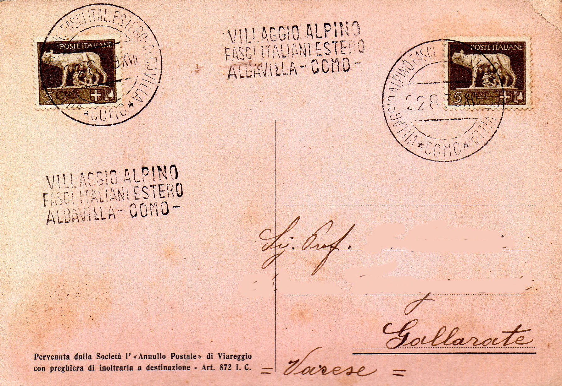 Come attesta il timbro postale: VILLAGGIO ALPINO FASCI ITALIANI ESTERO ALBAVILLA-COMO.